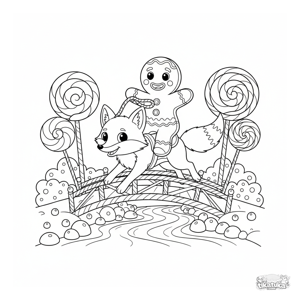 Ausmalbild aus einem Märchen: Ein Lebkuchenmann reitet auf einem Fuchs über eine Pfefferminzbrücke über einen Schokoladenfluss. Für Kinder von 6 bis 9 Jahren.