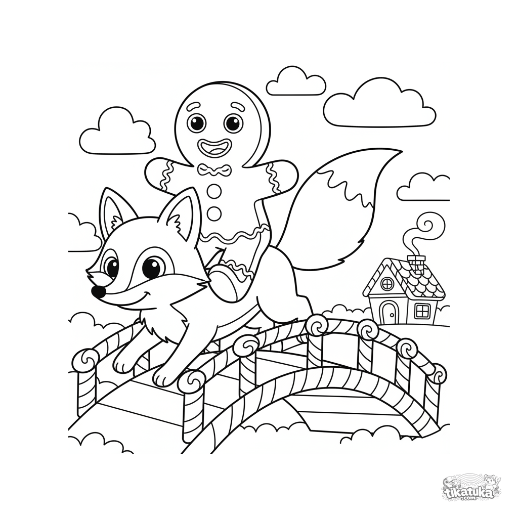 Einfaches Märchen-Ausmalbild: Ein Lebkuchenmann reitet auf einem Fuchs über eine Süßigkeitenbrücke. Für Kleinkinder von 2-5 Jahren.