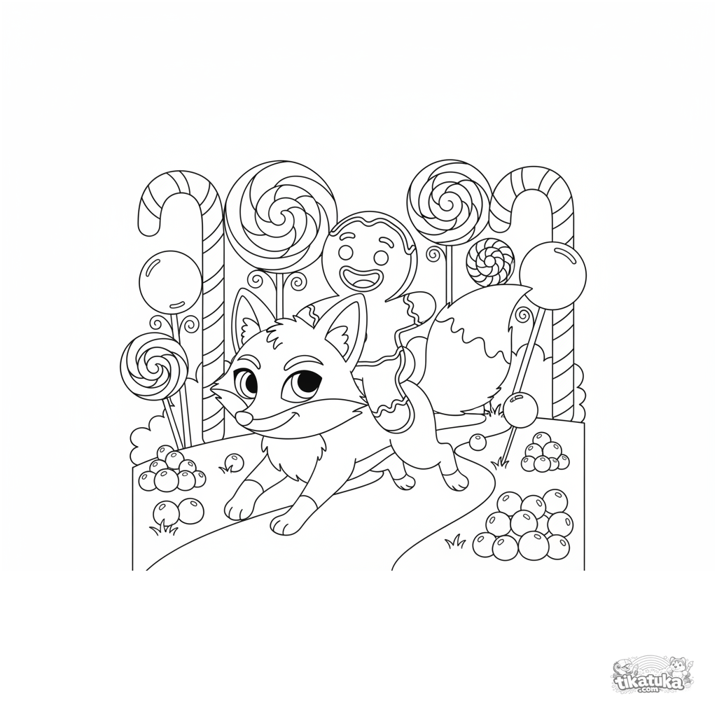 Ausmalbild des Märchen-Lebkuchenmanns, der auf einem Fuchs reitet. Für Kinder von 5-8 Jahren.