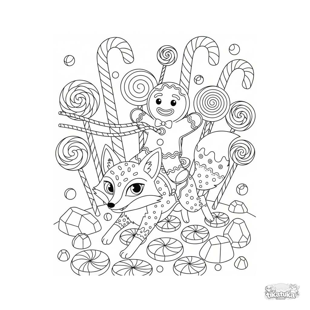 Märchen-Ausmalbild: ein Lebkuchenmann reitet auf einem Fuchs durch einen Süßigkeitenwald. Für Kinder von 6-9 Jahren. Magische Szene mit Zuckerstangen und Gummidrops.