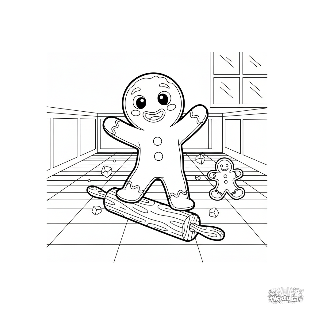 Märchen-Ausmalbild für Kinder 4-6: Ein fröhlicher Lebkuchenmann reitet auf einem Nudelholz wie ein Skateboard über einen Schachbrett-Küchenboden. Dynamische Szene, mittlerer Detaillierungsgrad.