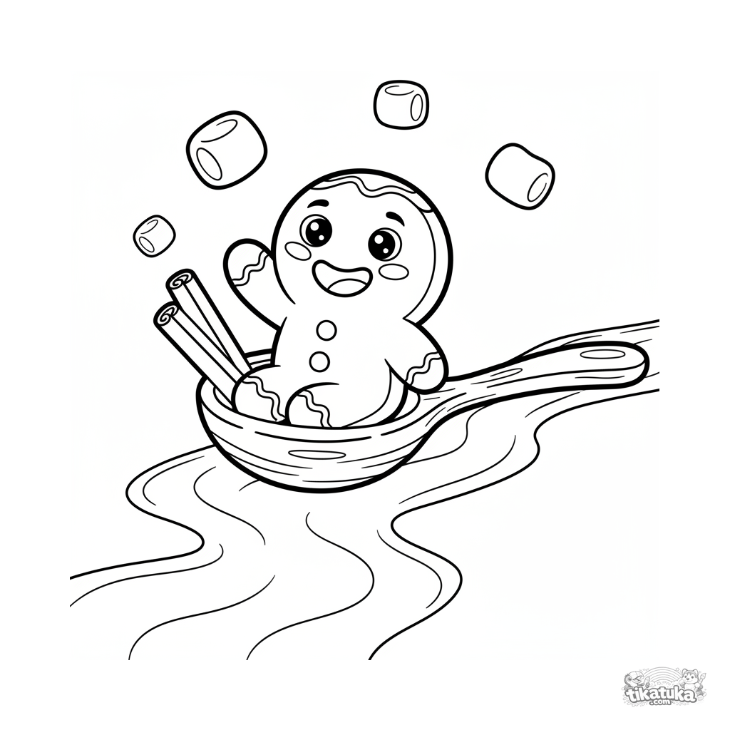 Ausmalbild eines fröhlichen Lebkuchenmanns, der auf einem Löffel-Boot einen Milchfluss hinunterfährt. Für Kleinkinder von 2-5 Jahren. Eine Märchenszene mit Süßigkeiten und Marshmallows.