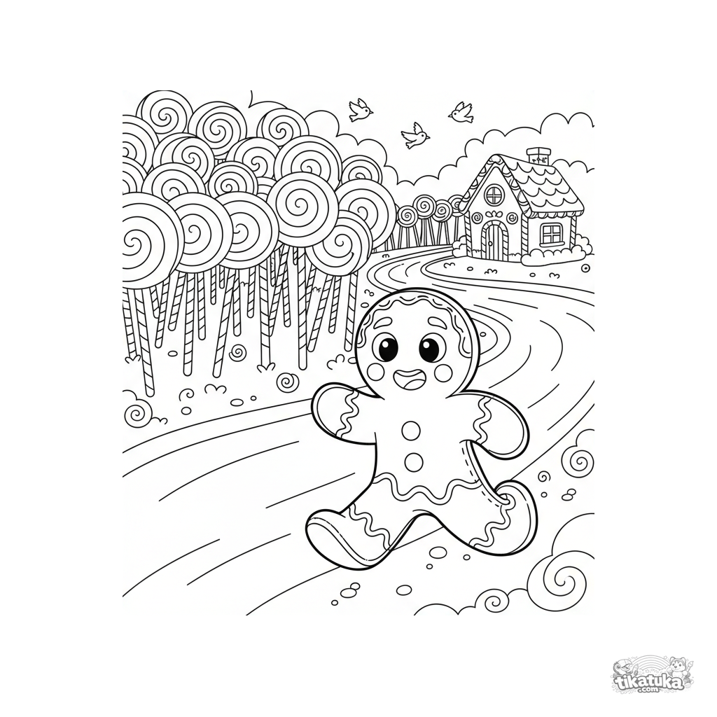 Märchen-Ausmalbild: Der Lebkuchenmann rennt alarmiert auf einen Milchfluss zu, dahinter ein magischer Süßigkeitenwald. Detaillierte Szene für Kinder von 7-12 Jahren.