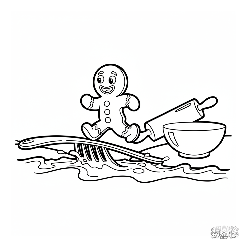 Einfaches Ausmalbild für Kleinkinder 2-3: Der Lebkuchenmann läuft über eine Gabelbrücke. Große, klare Formen, perfekt für erste Buntstifte.