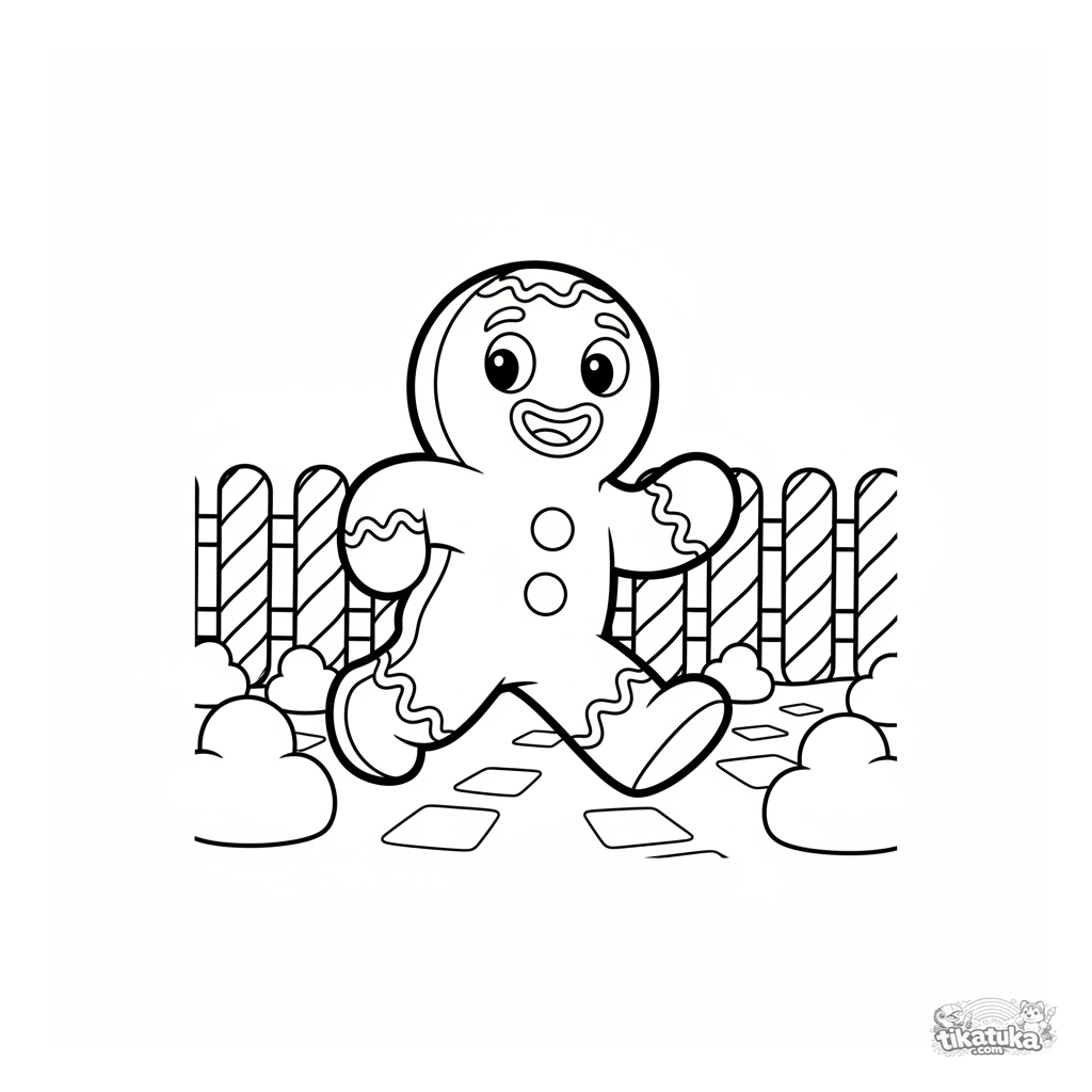 Einfaches Ausmalbild für Kleinkinder 2-4: der Lebkuchenmann auf der Flucht. Große Flächen zum Ausmalen, erkennbare Märchenfigur.