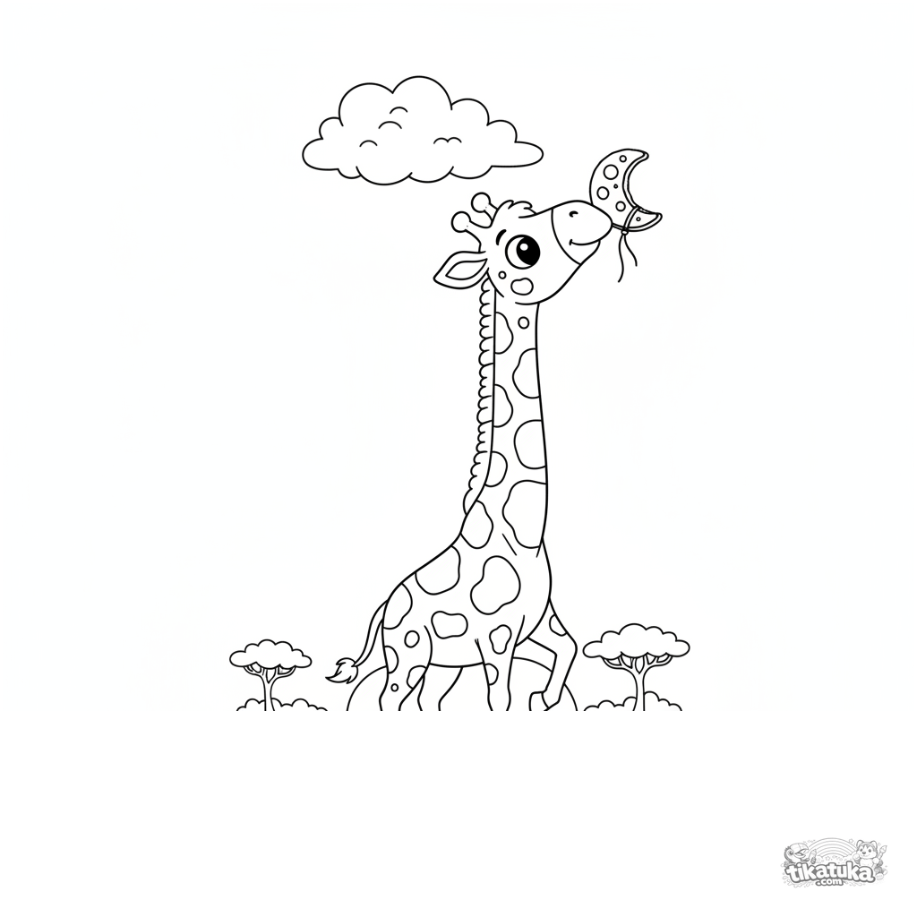 Ausmalbild für Kinder 4-6: Eine neugierige Giraffe mit Punkten streckt sich nach einem hängenden Mondkeks in einer Savannenszene. Ausgewogene Formen, mittlerer Detaillierungsgrad.