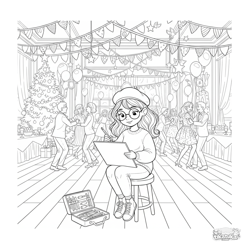 Ausmalbild für ältere Kinder 10-12: Ein Mädchen zeichnet Partygäste in einem dekorierten Saal. Hohes Detail, mehrschichtige Szene.