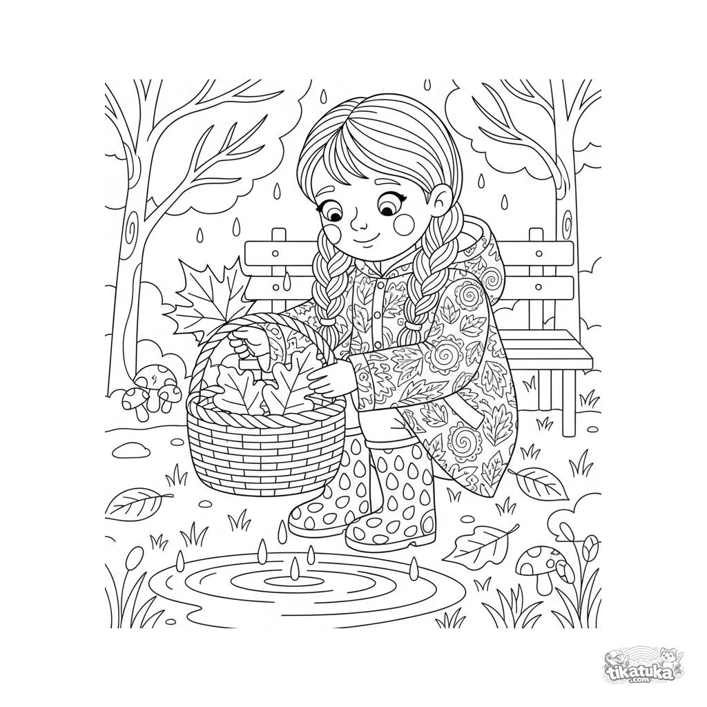 Ausmalbild für Kinder 4-6 Jahre: ein Mädchen in Stiefeln und Regenjacke sammelt bunte Herbstblätter in einem Korb in einem regnerischen Park. Klare Formen, ausgewogene Details.