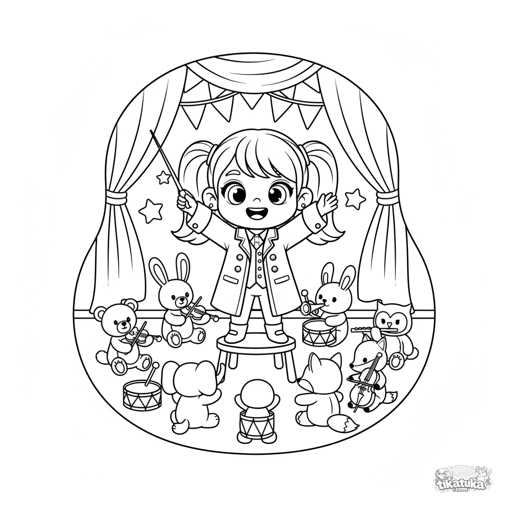 Ausmalbild für Kinder 7-9: Ein Mädchen dirigiert ein Spielzeugorchester aus Plüschtieren in einer Festhalle. Lustige, imaginative Szene.