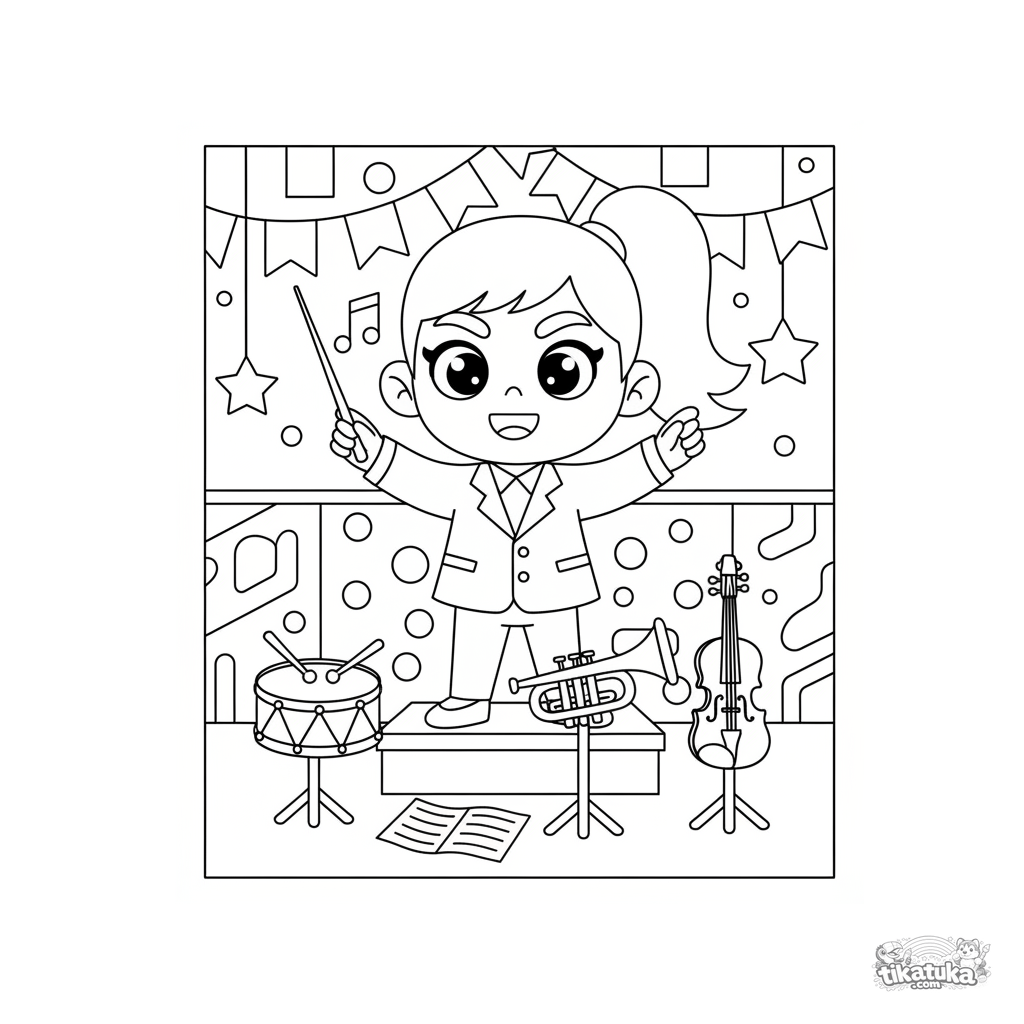 Ausmalbild für Kinder von 4-6 Jahren: Ein fröhliches Mädchen dirigiert ein Spielzeugorchester in einem Festsaal. Helle, dynamische Szene.