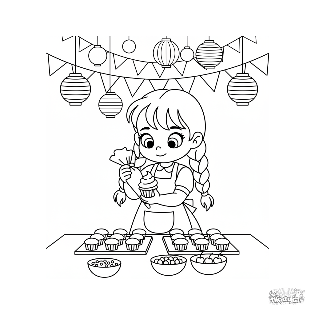 Ausmalbild für Kinder 4-6: Ein Mädchen mit Schürze konzentriert sich darauf, Cupcakes mit Zuckerguss und Streuseln an einem Tisch im festlichen Saal zu dekorieren. Vollkörper sichtbar.
