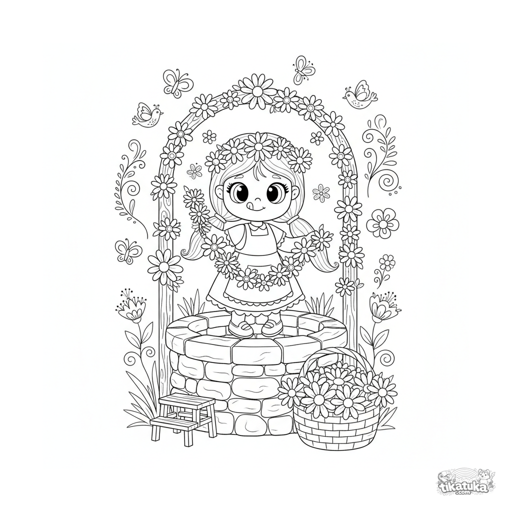 Helles Ausmalbild für Kinder 4-6: Ein Mädchen bereitet den Brunnen für ein Fest vor, indem sie ihn mit einer Blumengirlande schmückt. Klare Umrisse, Volksmuster.