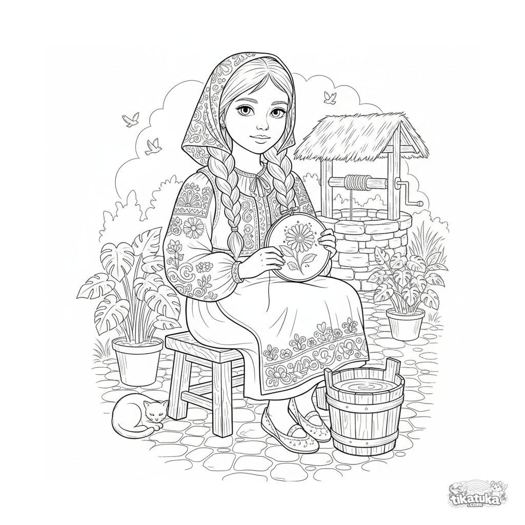 Ausmalbild für ältere Kinder 10-12: Ein Mädchen in Volkstracht stickt an einem Brunnen mit lebendigem Wasser. Detaillierte Dorflebensszene mit Mustern und einem Eimer.