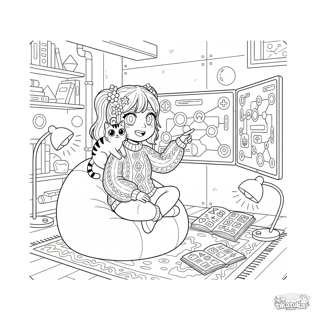 Ausmalbild für Kinder von 10-12 Jahren: eine Hackerin mit einer Katze arbeitet an drei Monitoren in einem gemütlichen Keller. Detaillierte Szene mit Diagrammen, Notizbüchern, Lampen und einem Sacksessel.