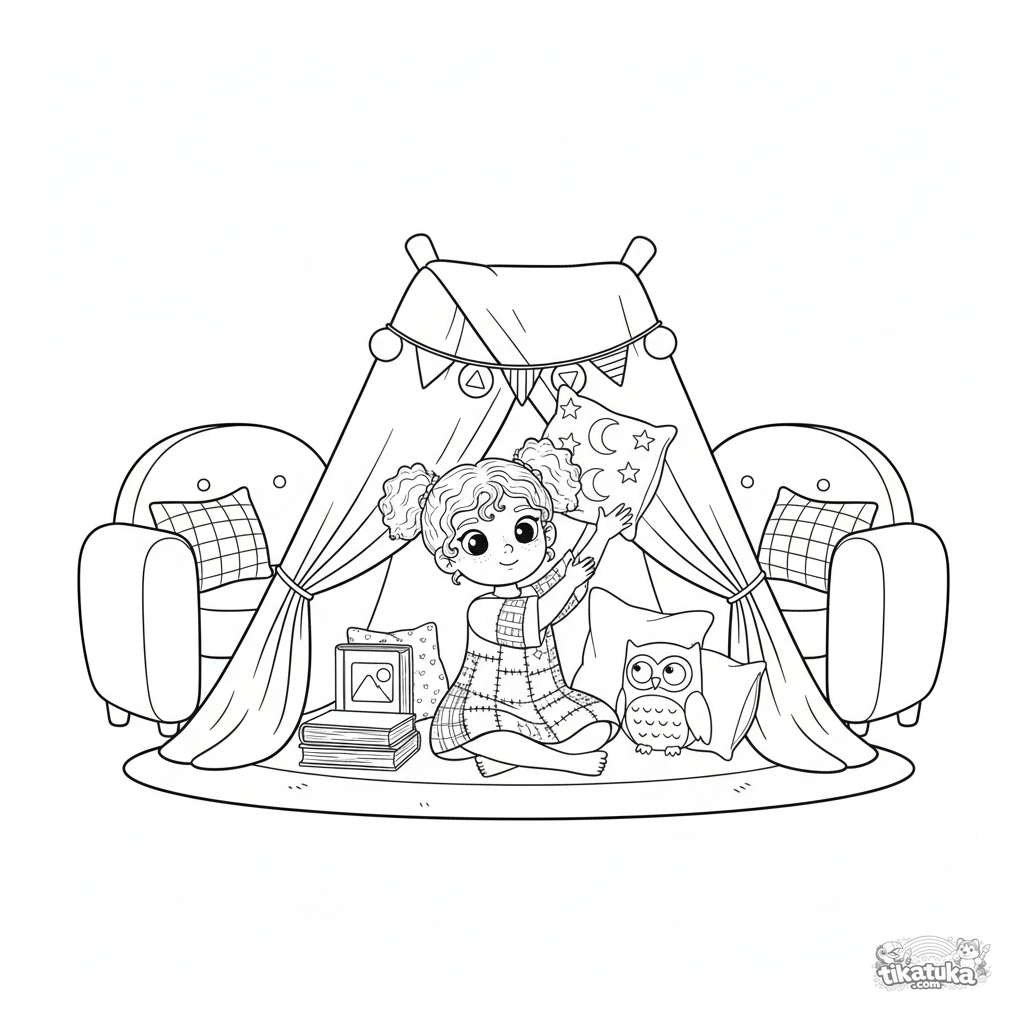 Ausmalbild eines Mädchens im Patchworkkleid, das ein gemütliches Decken- und Kissenfort baut. Für Kinder von 4 bis 7 Jahren.