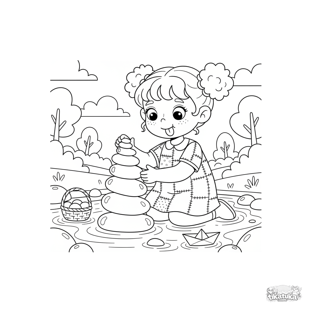 Ausmalbild für Mädchen: Ein Kind im Flickkleid baut einen Turm aus Flusssteinen am Bach. Für Kinder von 5-8 Jahren. Szene mit Korb und Papierboot.
