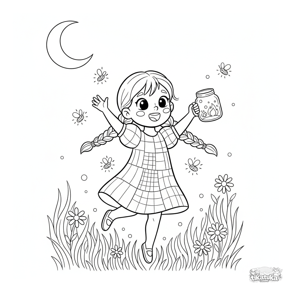 Ausmalbild für Mädchen: Ein Kind im Kleid jagt Glühwürmchen auf einer Sommerwiese. Für Kinder von 5-7 Jahren.