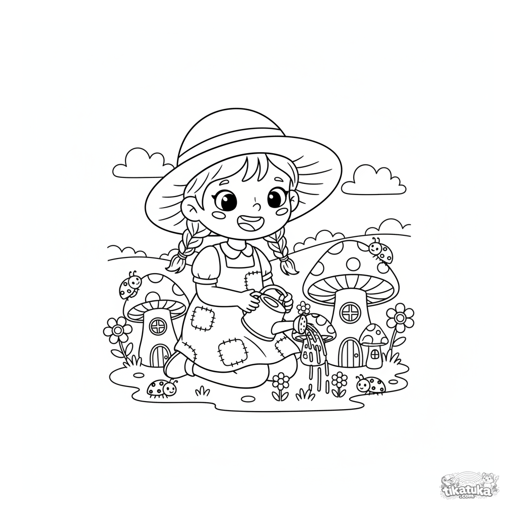 Ausmalbild für Mädchen 4-6: Ein fröhliches Mädchen im Kleid gießt magische Pilzhäuser. Eine niedliche Märchenszene mit einfachen Details zum Ausmalen.