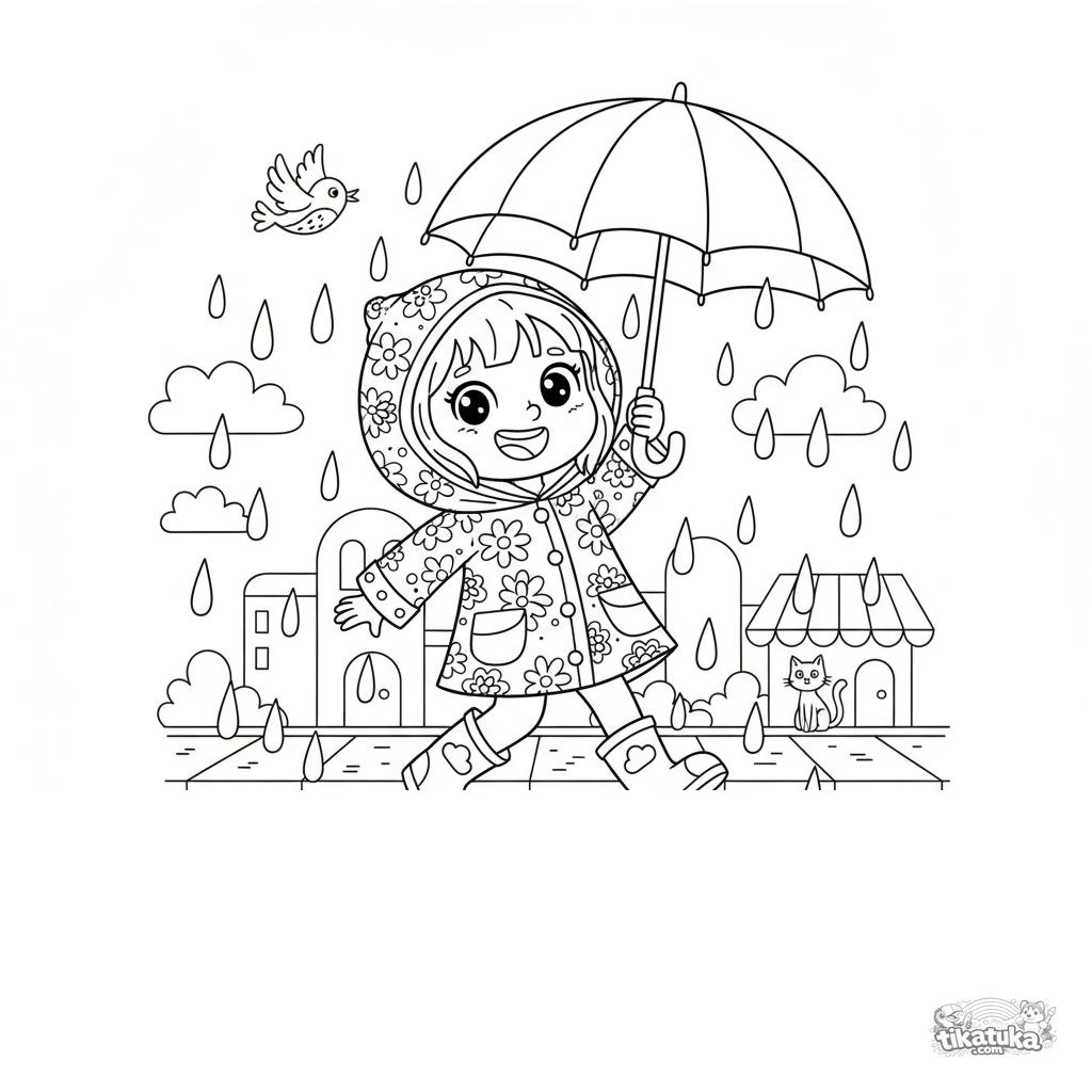Ausmalbild für Kinder: Ein fröhliches Mädchen in Regenjacke hüpft in Pfützen unter einem großen Schirm. Ausgewogene Details.
