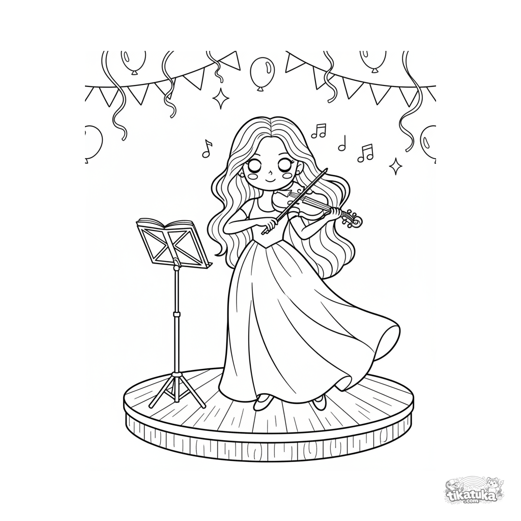Ausmalbild für Kinder 7-9: Ein Mädchen im Anime-Stil spielt Geige auf einer Bühne in einem Festsaal. Musikaufführungsszene.