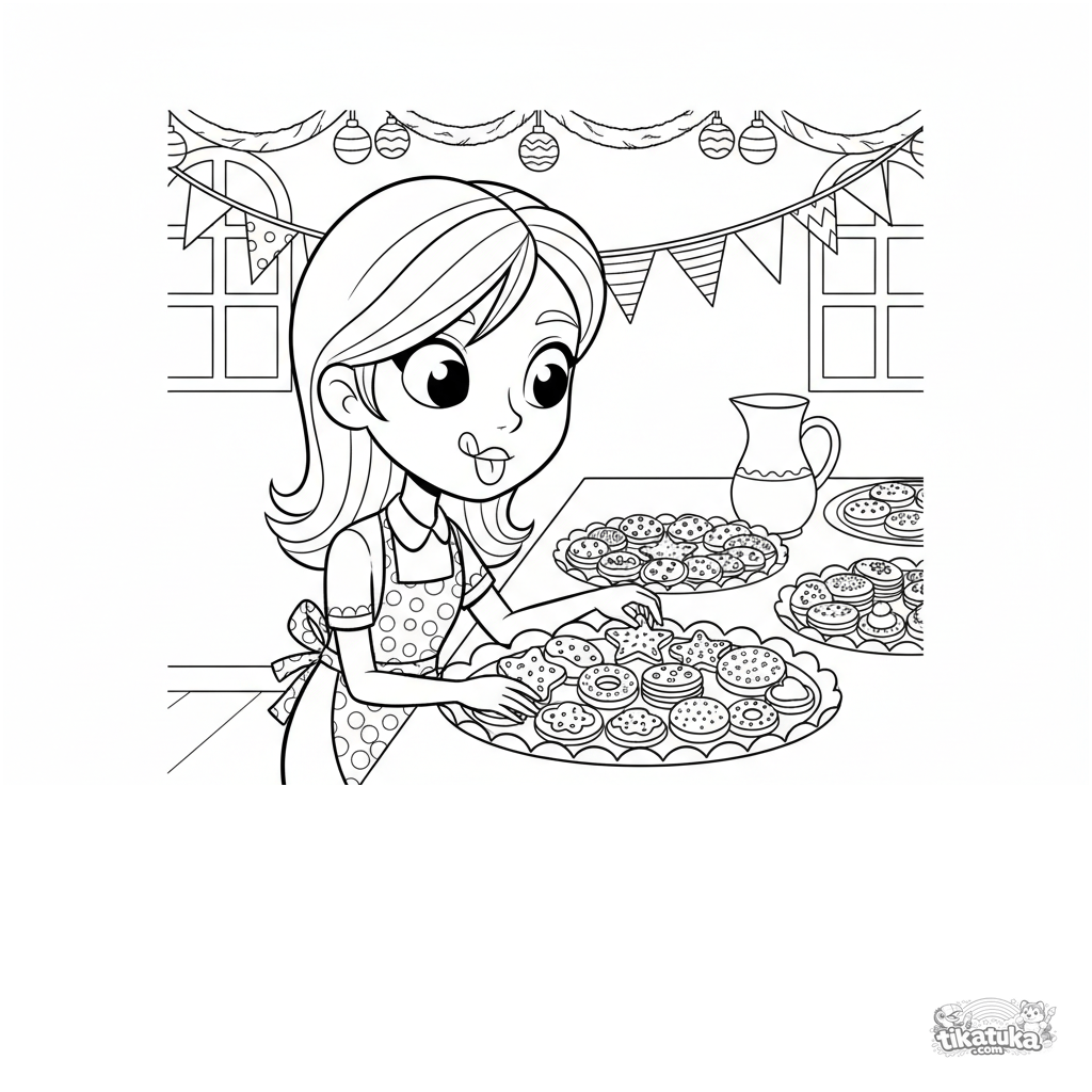 Ausmalbild für Tweens 7-9: Ein Mädchen in einer Schürze richtet Kekse auf einem Tablett in einem festlichen Saal her. Szene der Vorbereitung von Leckereien.