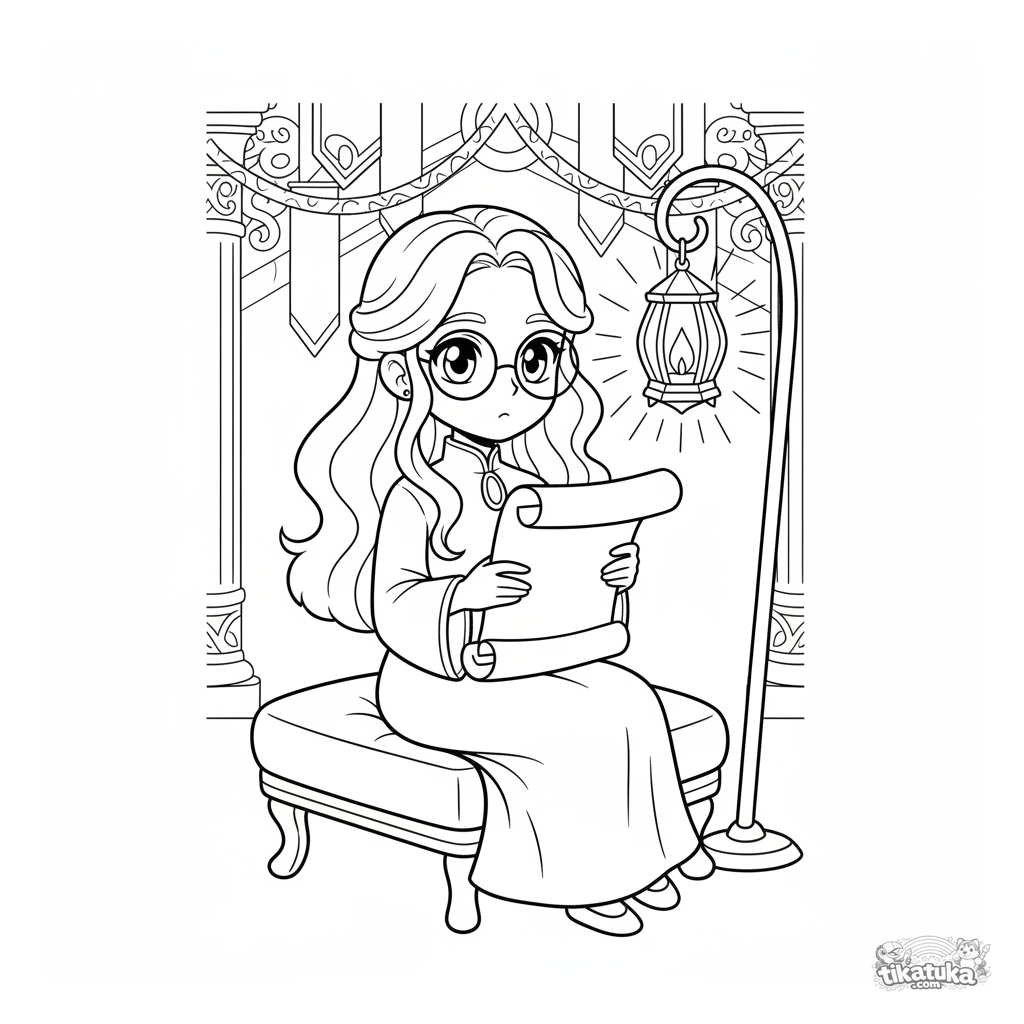 Ausmalbild für Tweens 7-9: Ein Mädchen mit Brille macht es sich in einem festlichen Saal gemütlich und liest eine alte Schriftrolle am Licht einer Laterne.