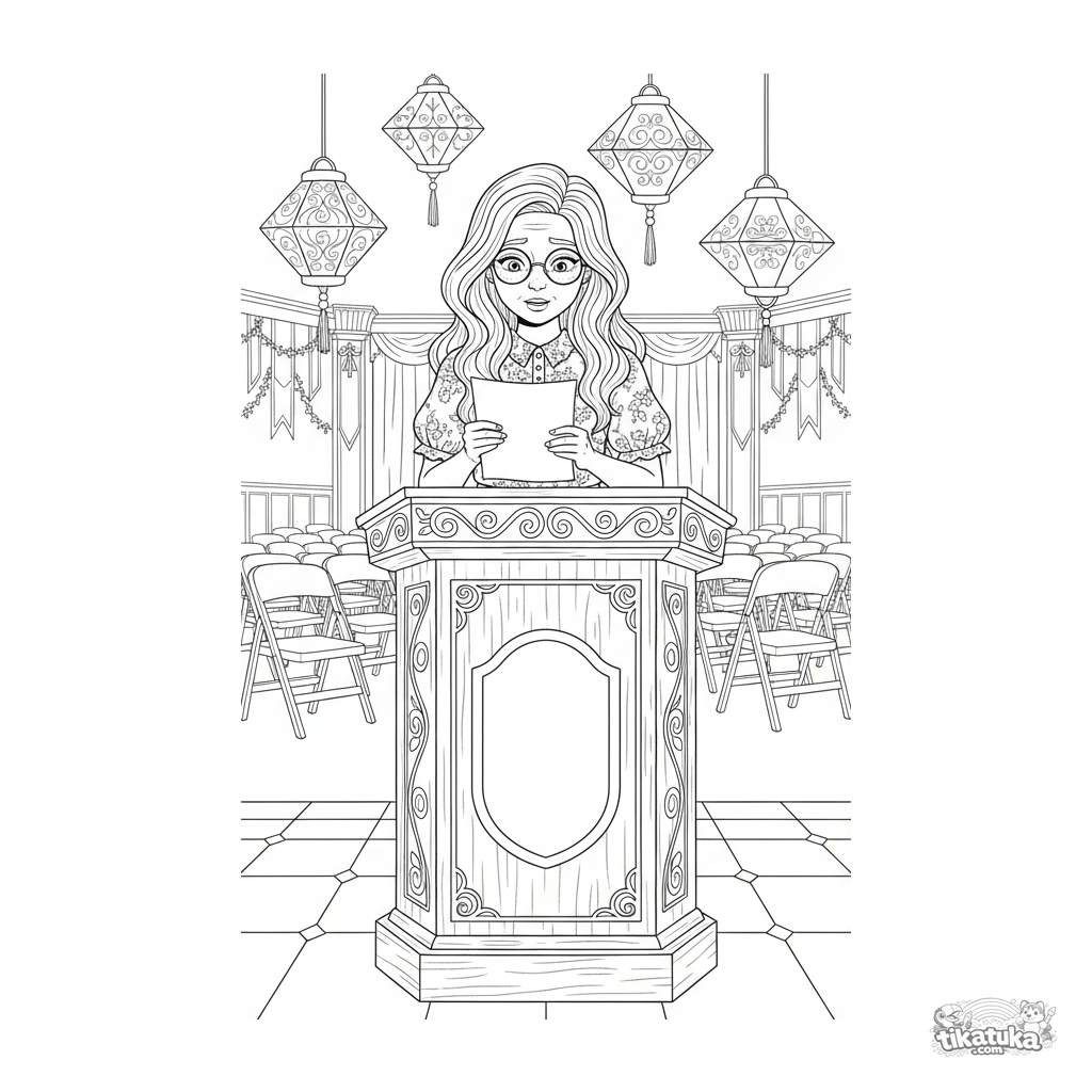 Detailliertes Ausmalbild für ältere Kinder 10-12: Ein Mädchen mit Brille liest ein Gedicht vom Rednerpult in einer dekorierten Festhalle.