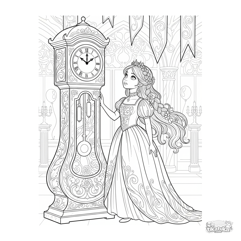 Ausmalbild für Kinder 4-6: Ein Mädchen in einem historischen Kleid bewundert eine große Standuhr in einer Festhalle. Szene mit schönen Mustern.