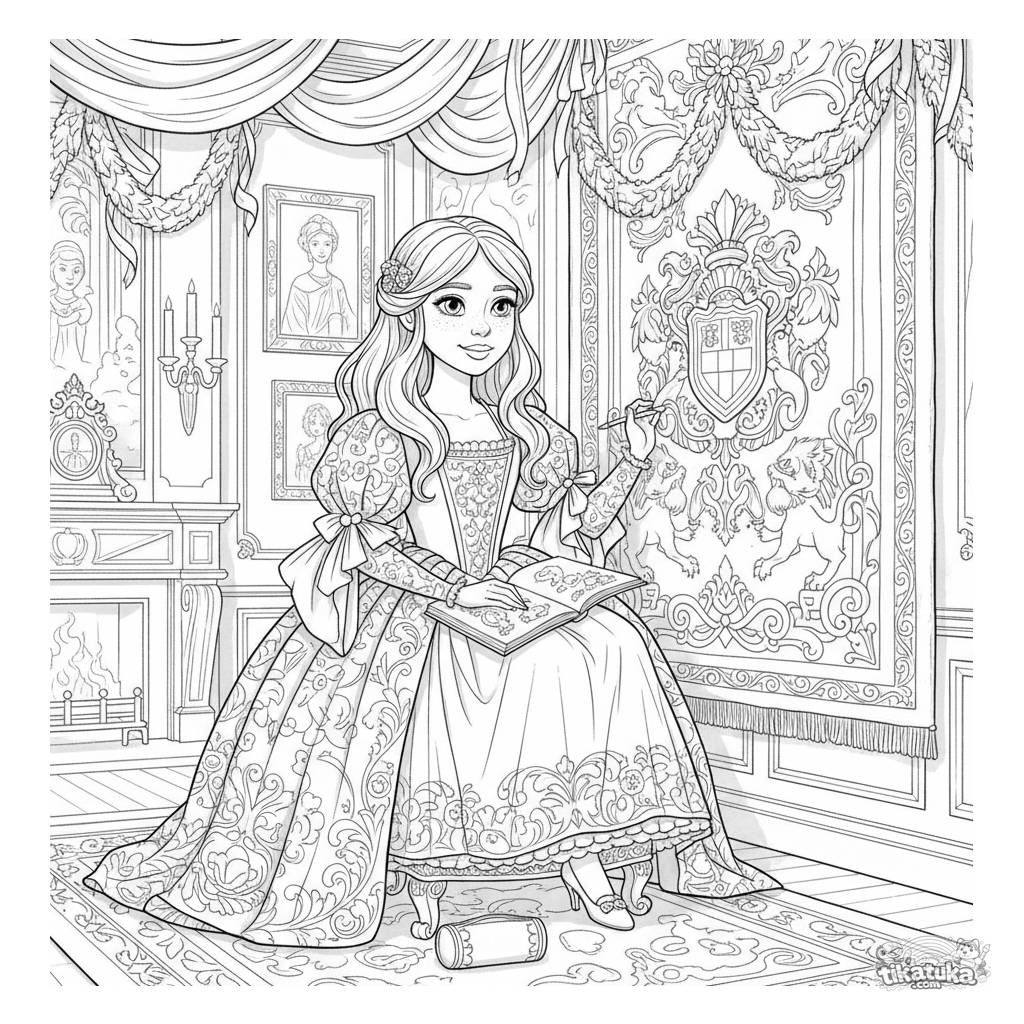 Komplexes Ausmalbild für Kinder 10-12: Ein Mädchen in einem historischen Kleid skizziert die Dekorationen eines Ballsaals.