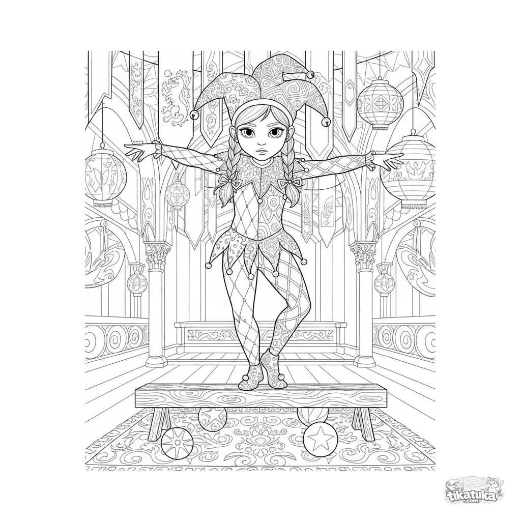 Ausmalbild für ältere Kinder 10-12: Ein Mädchen im Narrenkostüm balanciert auf einem Balken in einem festlichen Saal. Detaillierte Szene mit Zirkuselementen.