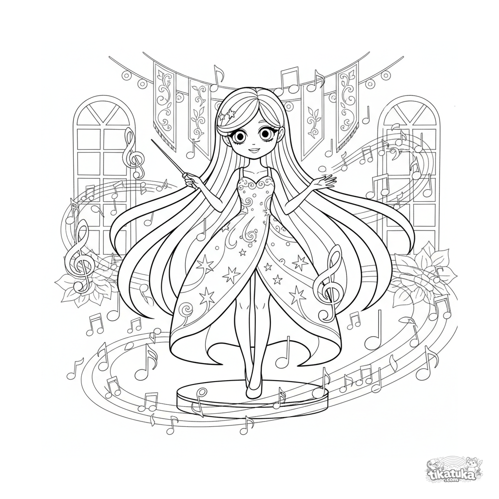 Ausmalbild für Mädchen 7-9: Ein magisches Mädchen in einem Festtagssaal dirigiert und lässt schwebende Noten um sich wirbeln. Fantasieszene mit Musik.