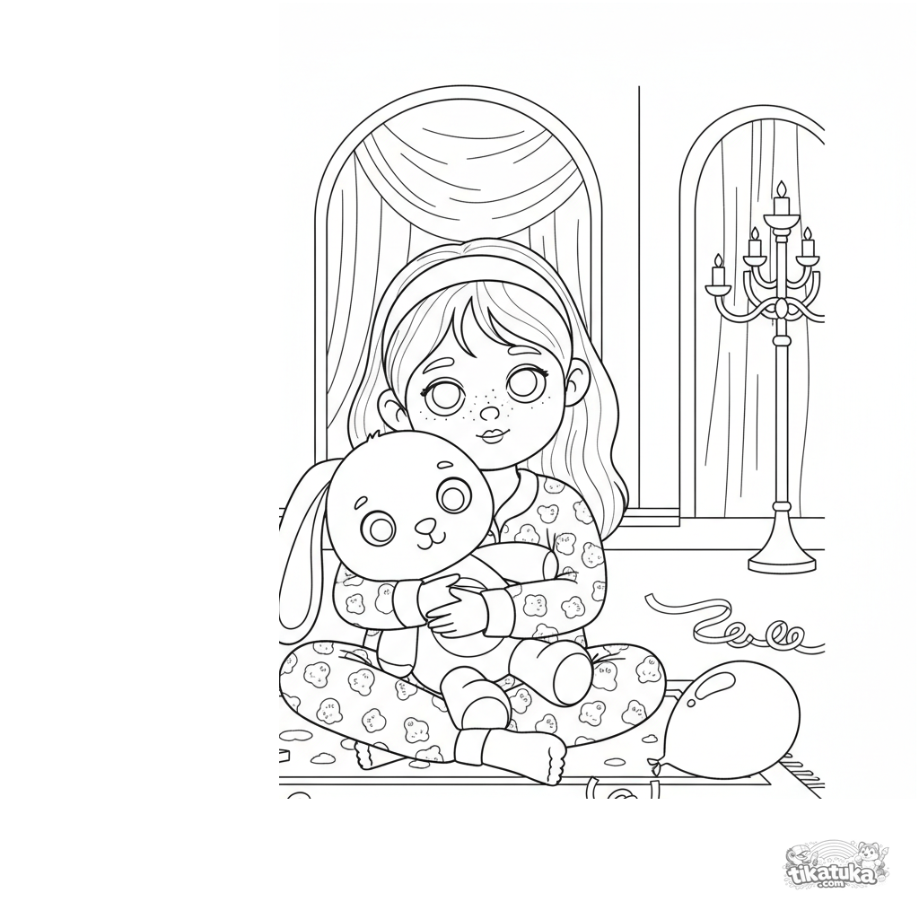 Ausmalbild für Kinder 4-6: Ein Mädchen im gemütlichen Schlafanzug sitzt auf dem Boden einer Festhalle mit einem Kuschelhasen nach der Feier. Einfache Szene, klare Formen.