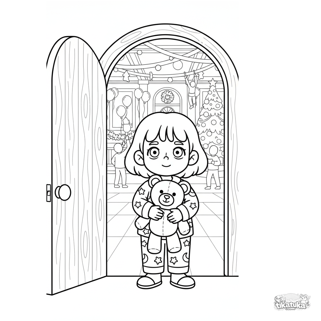 Ausmalbild für Kinder 7-9: Ein Mädchen im Schlafanzug mit einem Spielzeug beobachtet die Dekoration eines Festraums.