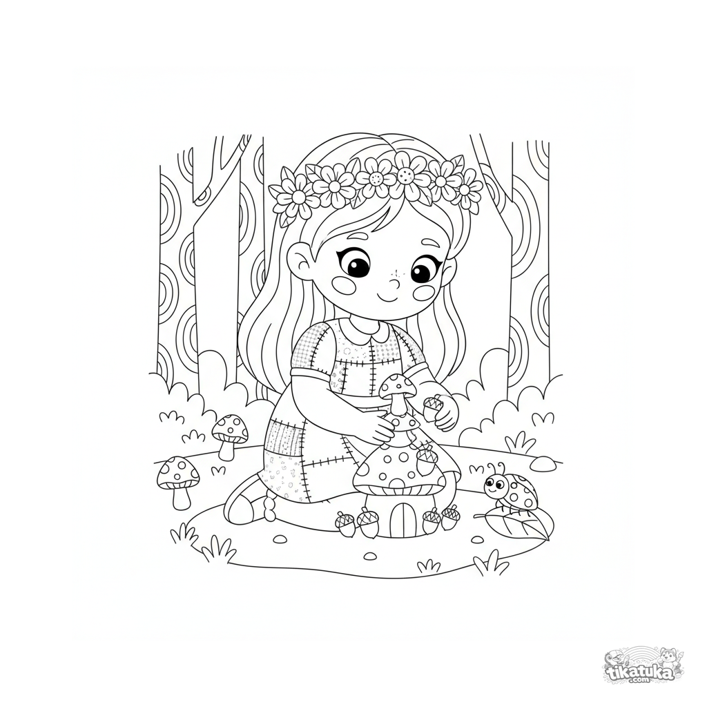Ausmalbild für Mädchen 4-6: Ein fröhliches Mädchen im Flickwerk-Kleid baut ein winziges Feenhaus aus Pilzen und Eicheln in einem moosigen Wald.