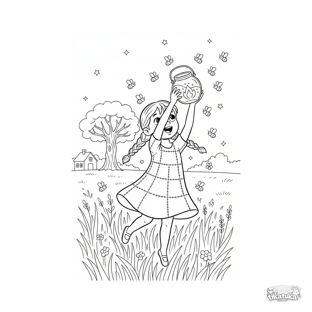Ausmalbild für Mädchen 4-6: Ein fröhliches Mädchen im Flickenkleid läuft in der Dämmerung über eine Wiese und versucht, Glühwürmchen zu fangen. Süße Szene mit breiten Rändern.
