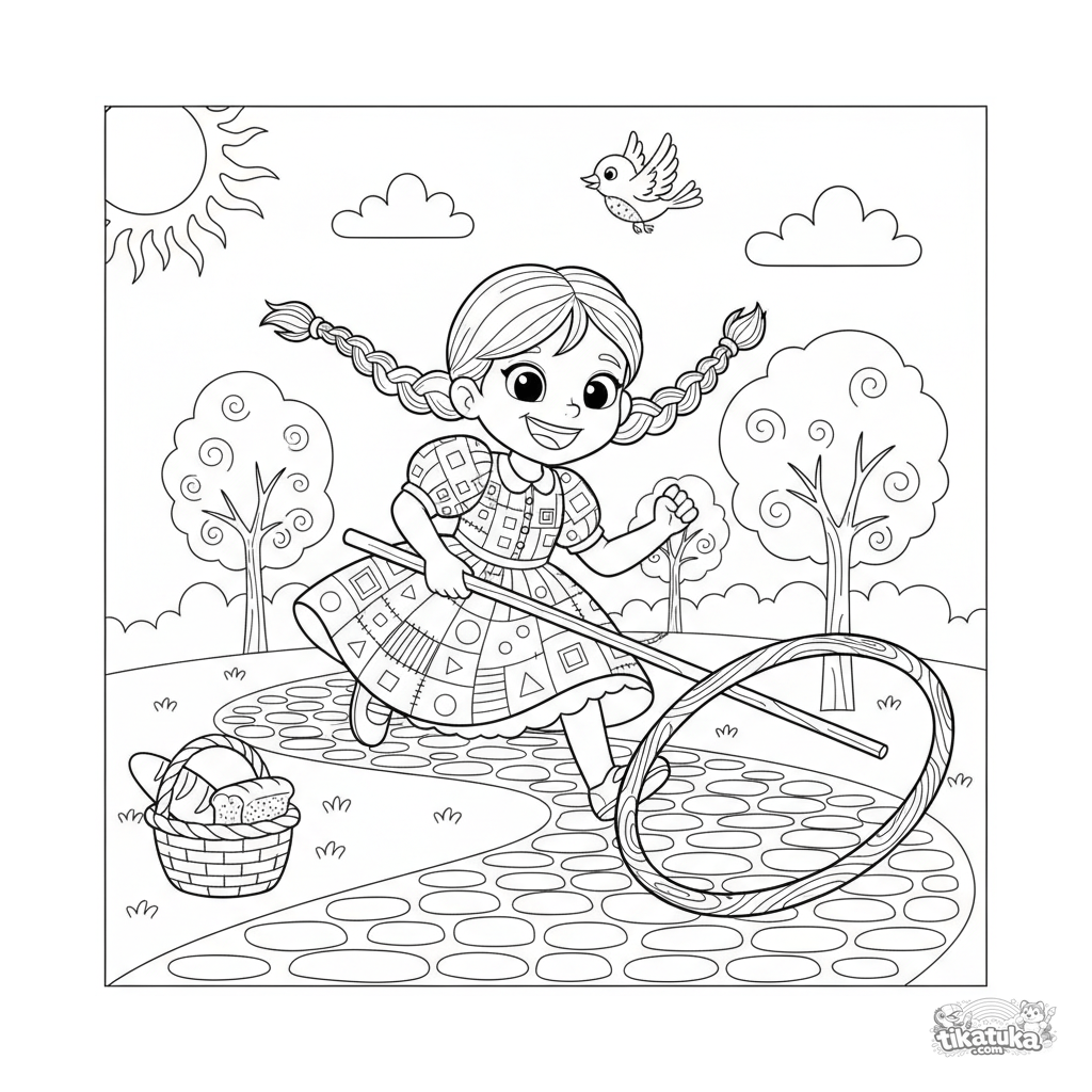 Ausmalbild für Mädchen 4-6: Ein fröhliches Mädchen in einem Flickkleid läuft und rollt einen Reifen über einen gewundenen Kopfsteinweg. Dynamische und freudige Szene.