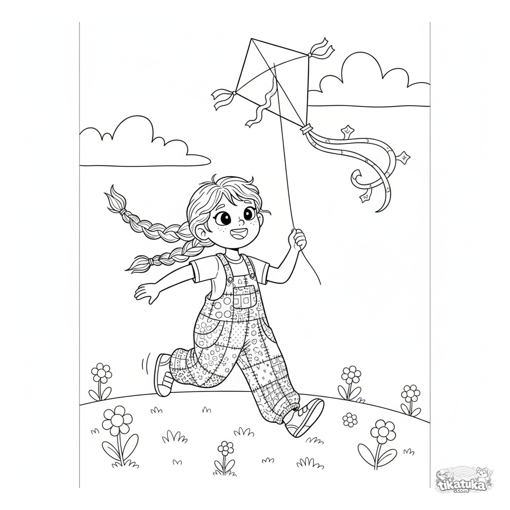 Ausmalbild für Mädchen: ein fröhliches Mädchen in Latzhose lässt einen Drachen auf einem windigen Hügel steigen. Für Kinder von 3-6 Jahren. Einfache Linien, Blumen und Wolken.