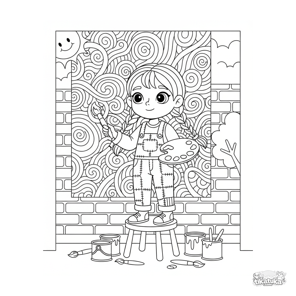 Ausmalbild eines fröhlichen Mädchens in Patchwork-Overalls, das ein großes Wandgemälde malt. Für Kinder von 5-8 Jahren.