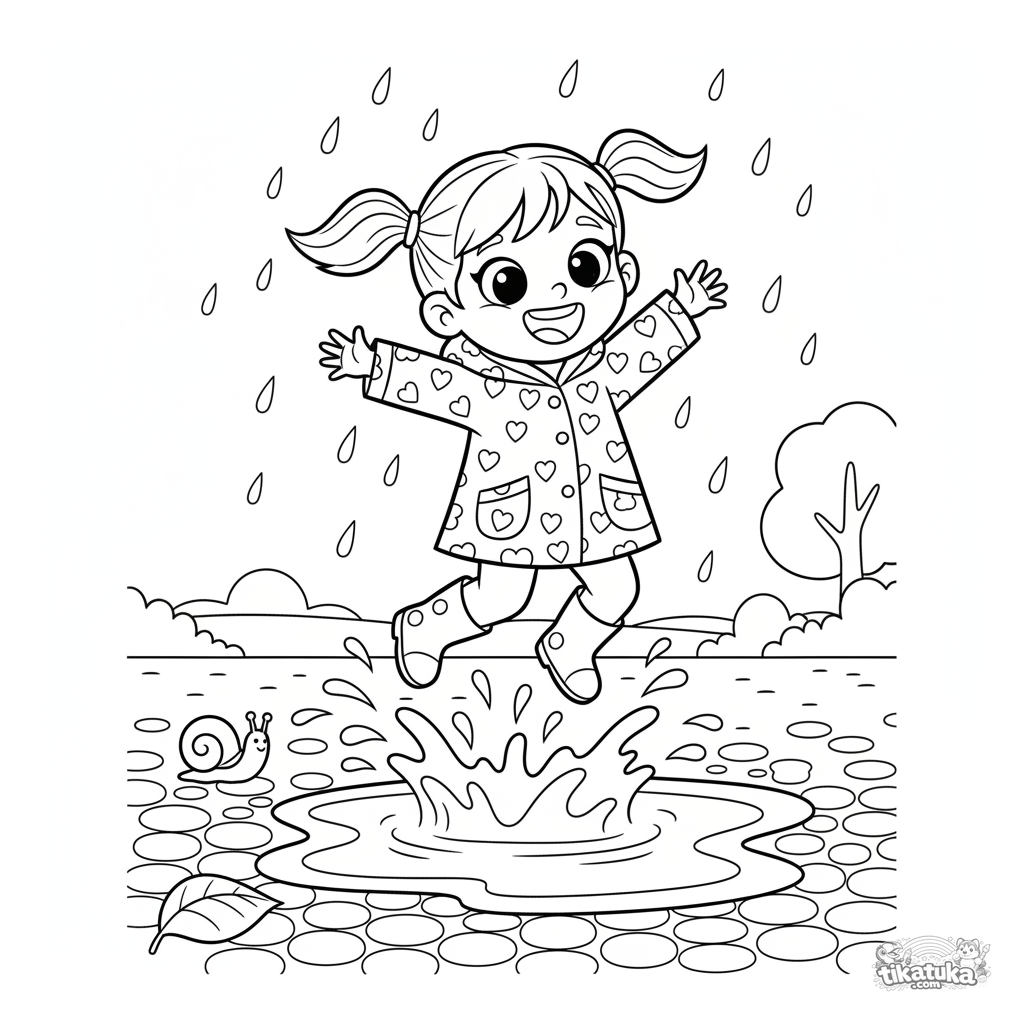 Ausmalbild eines fröhlichen Mädchens in einer Regenjacke, das glücklich in Matschpfützen springt. Für Kinder von 4 bis 6 Jahren.