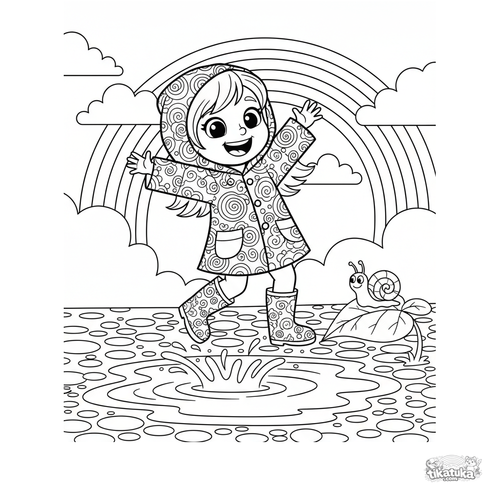 Lustiges Ausmalbild für Mädchen von 4-6 Jahren: Ein Mädchen in einem hellen Regenmantel springt in eine Pfütze unter einem Regenbogen. Klare Szene mit positiver Stimmung.