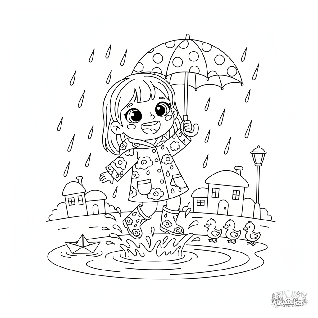 Lustiges Ausmalbild eines Mädchens in einer Regenjacke, das an einem regnerischen Tag in eine Pfütze springt. Für Kinder von 5-8 Jahren. Enthält einen Regenschirm, Entenküken und ein Papierboot.