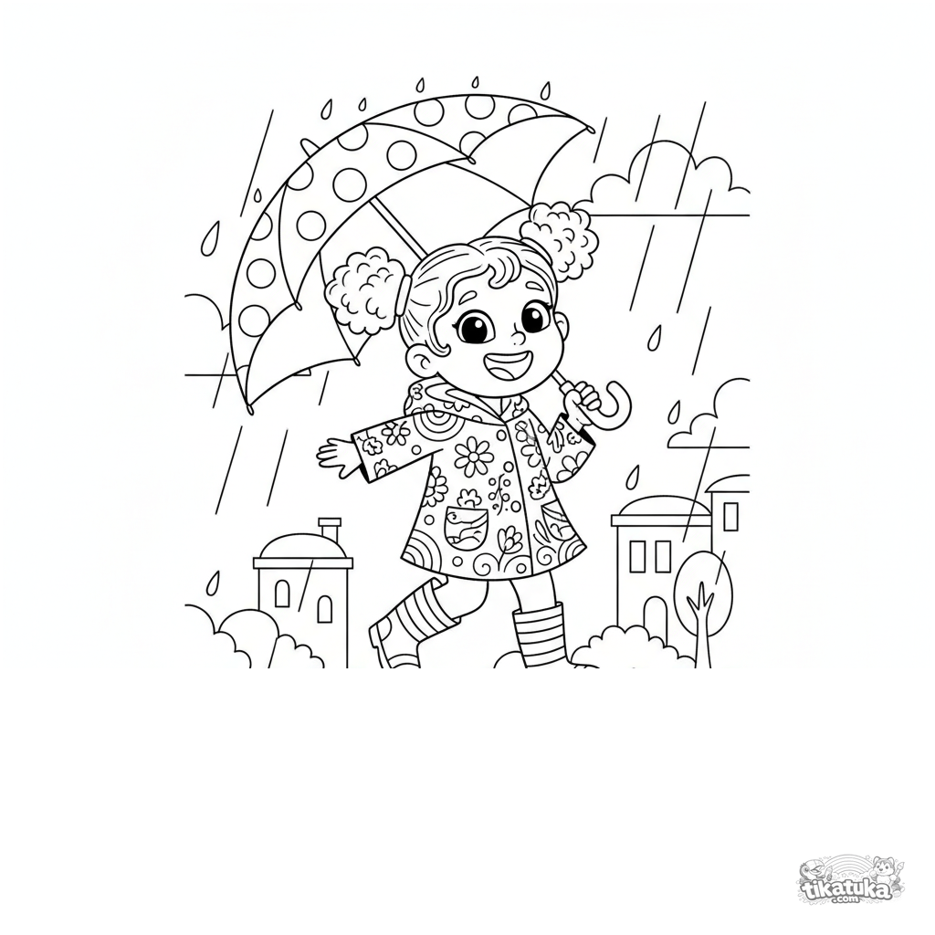 Ausmalbild eines fröhlichen Mädchens in einer Regenjacke, das mit einem Regenschirm in Pfützen hüpft. Für Kinder von 3 bis 6 Jahren.