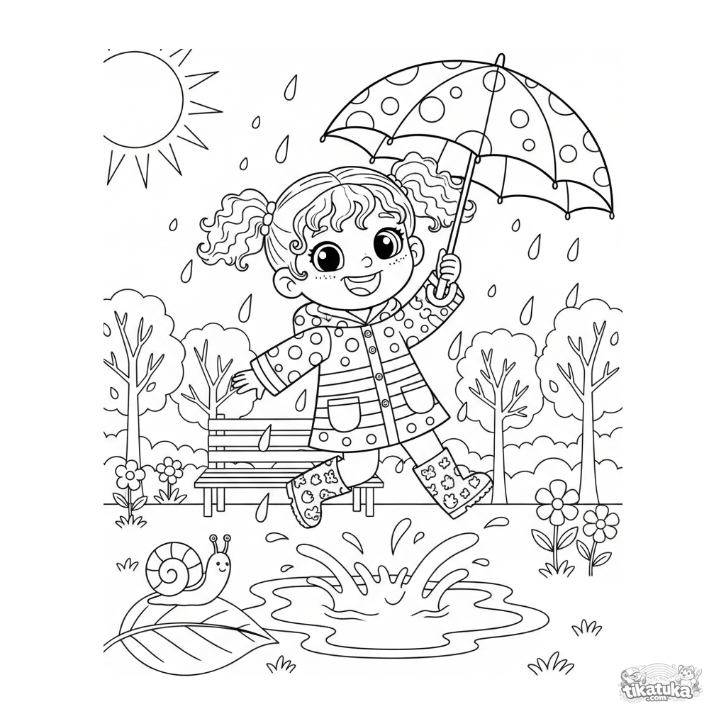 Ausmalbild eines fröhlichen Mädchens in einem Regenmantel, das über Pfützen mit einem Regenschirm in einem Frühlingspark springt. Für Mädchen von 4-6 Jahren.