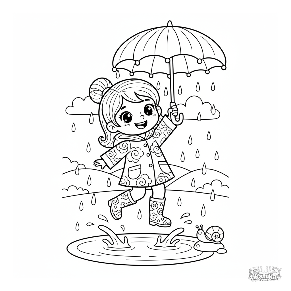 Ausmalbild eines fröhlichen Mädchens in einer Regenjacke, das in Pfützen springt, unter einem blumenförmigen Regenschirm. Für Kinder von 3-6 Jahren. Eine Regentag-Szene mit einer Schnecke.