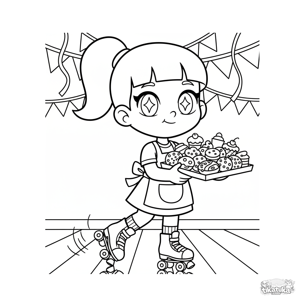 Ausmalbild für Kinder 7-9 Jahre: ein Mädchen auf Rollschuhen trägt ein Tablett mit Leckereien durch einen festlichen Saal. Dynamische Pose, mäßiges Detail, volle Figur.
