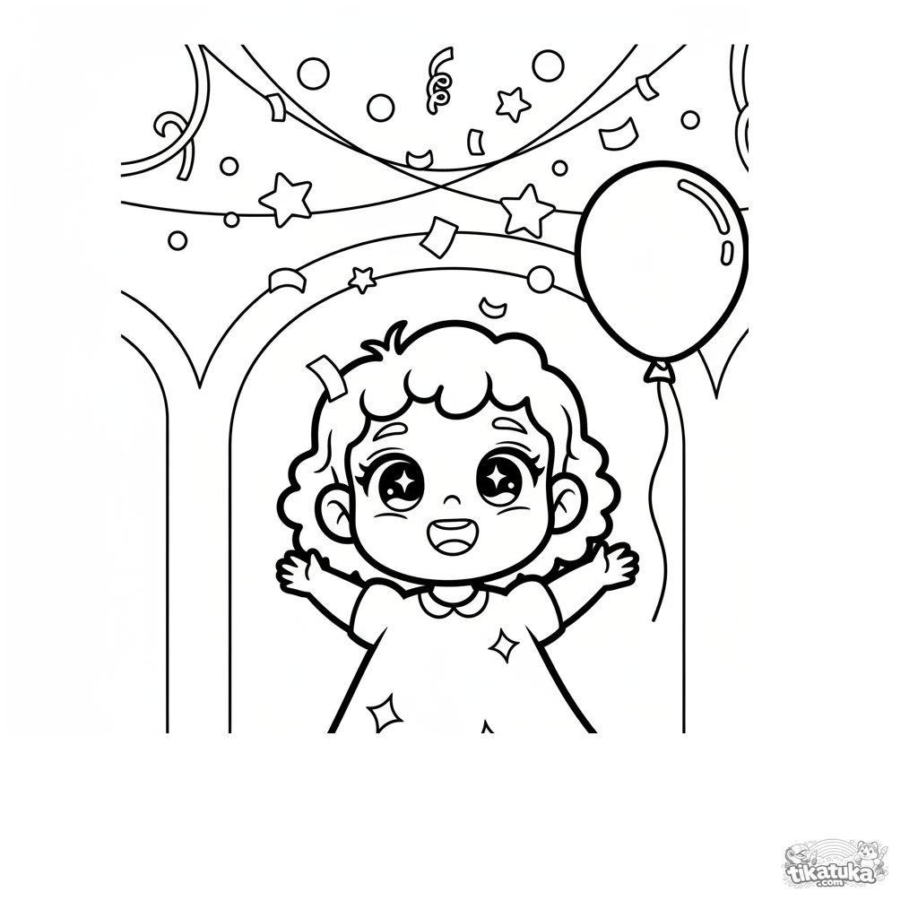 Ausmalbild für Kleinkinder 2-3: Ein Mädchen schaut Konfetti in einem festlichen Saal zu. Sehr einfache Formen, minimales Detail.