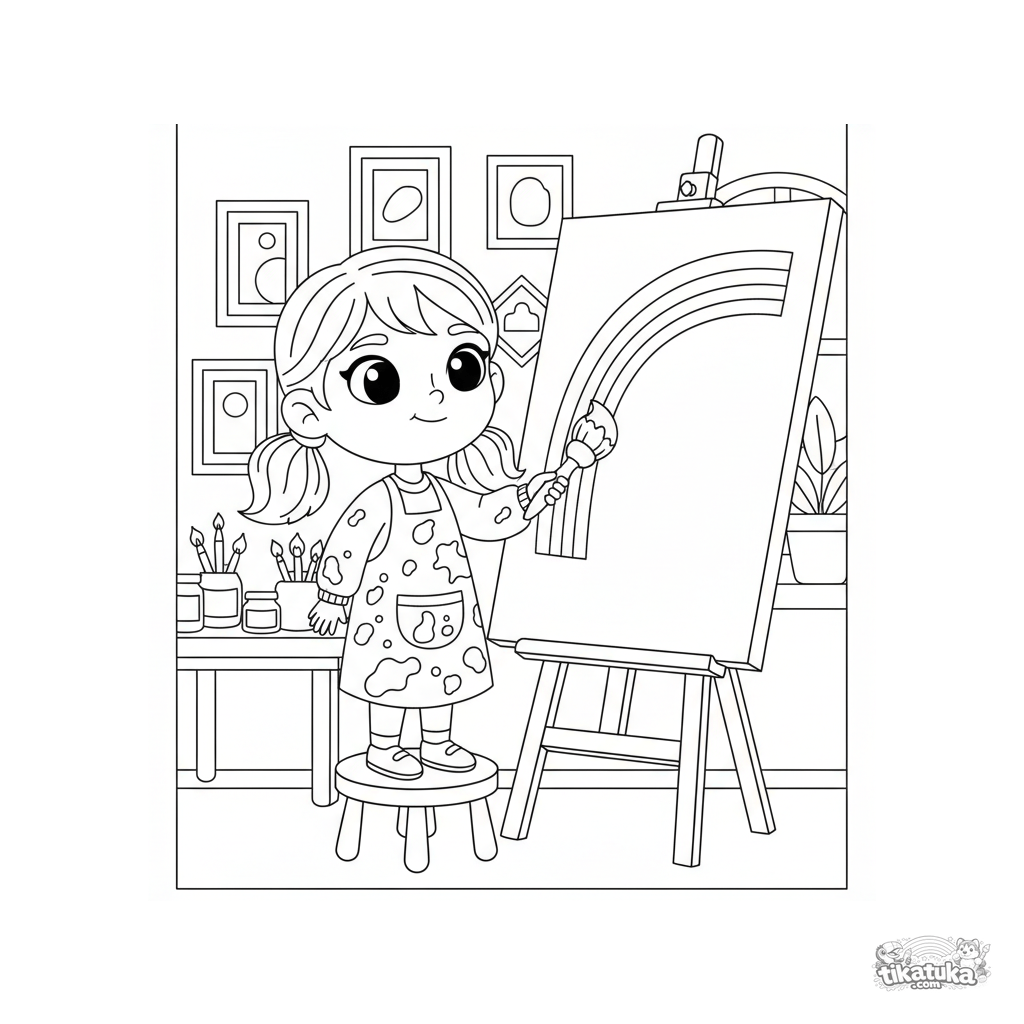 Ausmalbild eines fröhlichen Mädchen-Künstlers, der einen Regenbogen auf eine große Leinwand in seinem Atelier malt. Für Kinder von 4-6 Jahren. Eine Szene der Kreativität und Inspiration.
