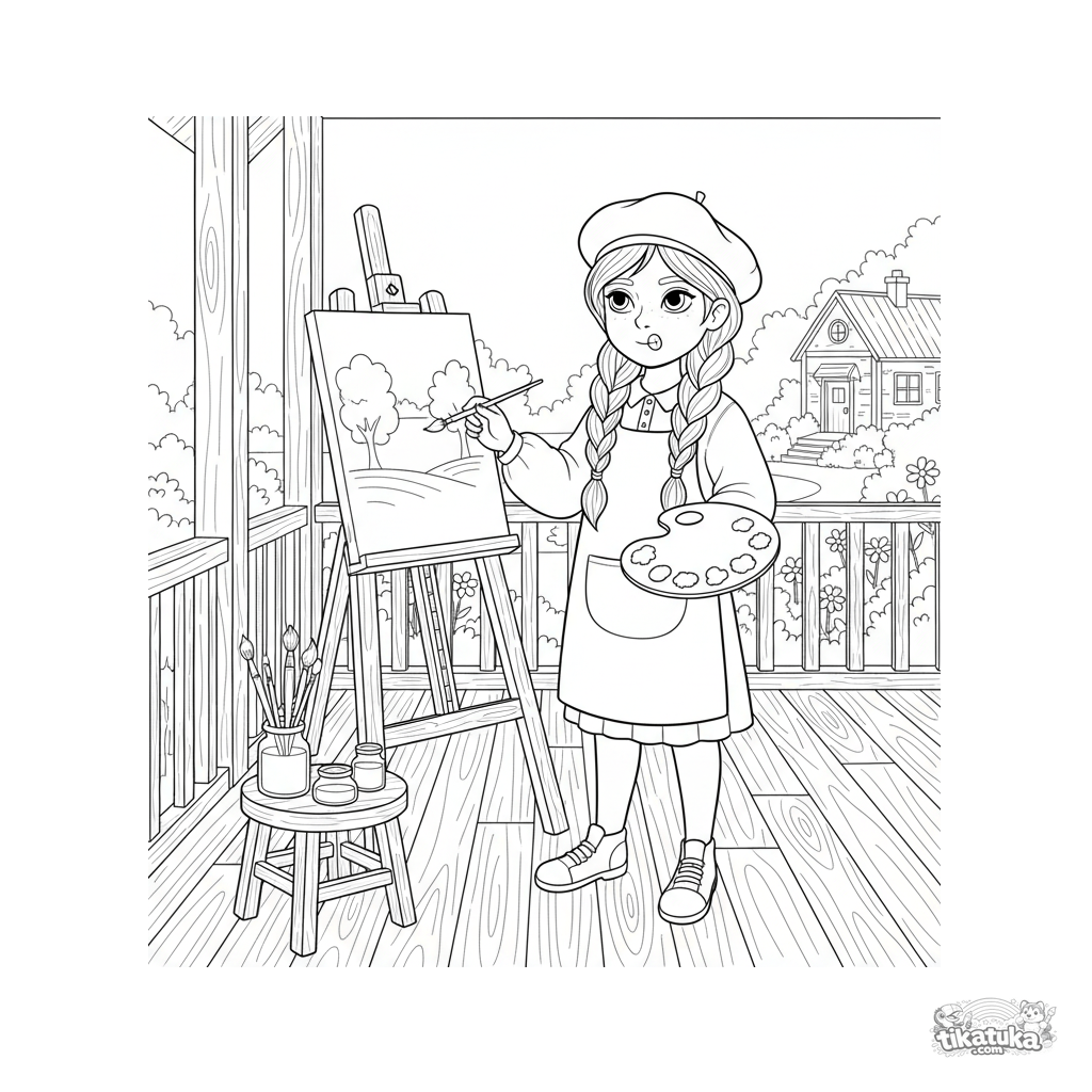 Detailliertes Ausmalbild für ältere Kinder 10-12: Ein Mädchen malt ein Aquarell auf einer Staffelei. Szene mit Kunstzubehör zum kreativen Ausmalen.