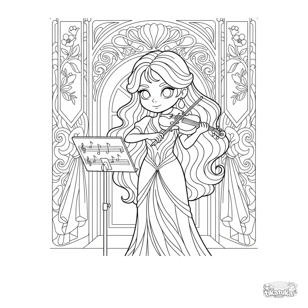 Ausmalbild für Kinder 4-6: Ein Mädchen spielt Geige in einer dekorierten Festhalle, ein Notenständer steht daneben. Klare Umrisse, breite Ränder.