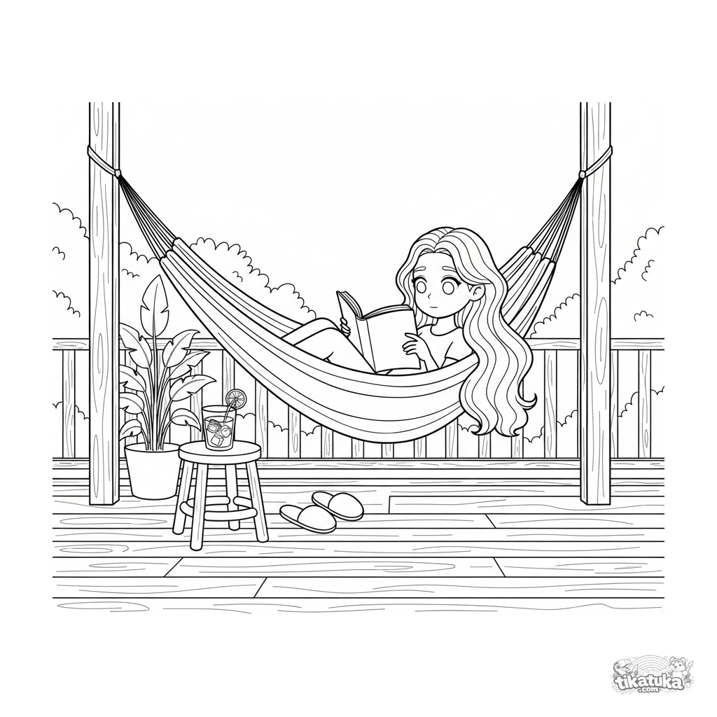 Ausmalbild für 7-9 Jahre: Ein Mädchen liest ein Buch in einer Hängematte auf einer geräumigen Veranda. Gemütliche Szene mit Hausschuhen und Eistee.